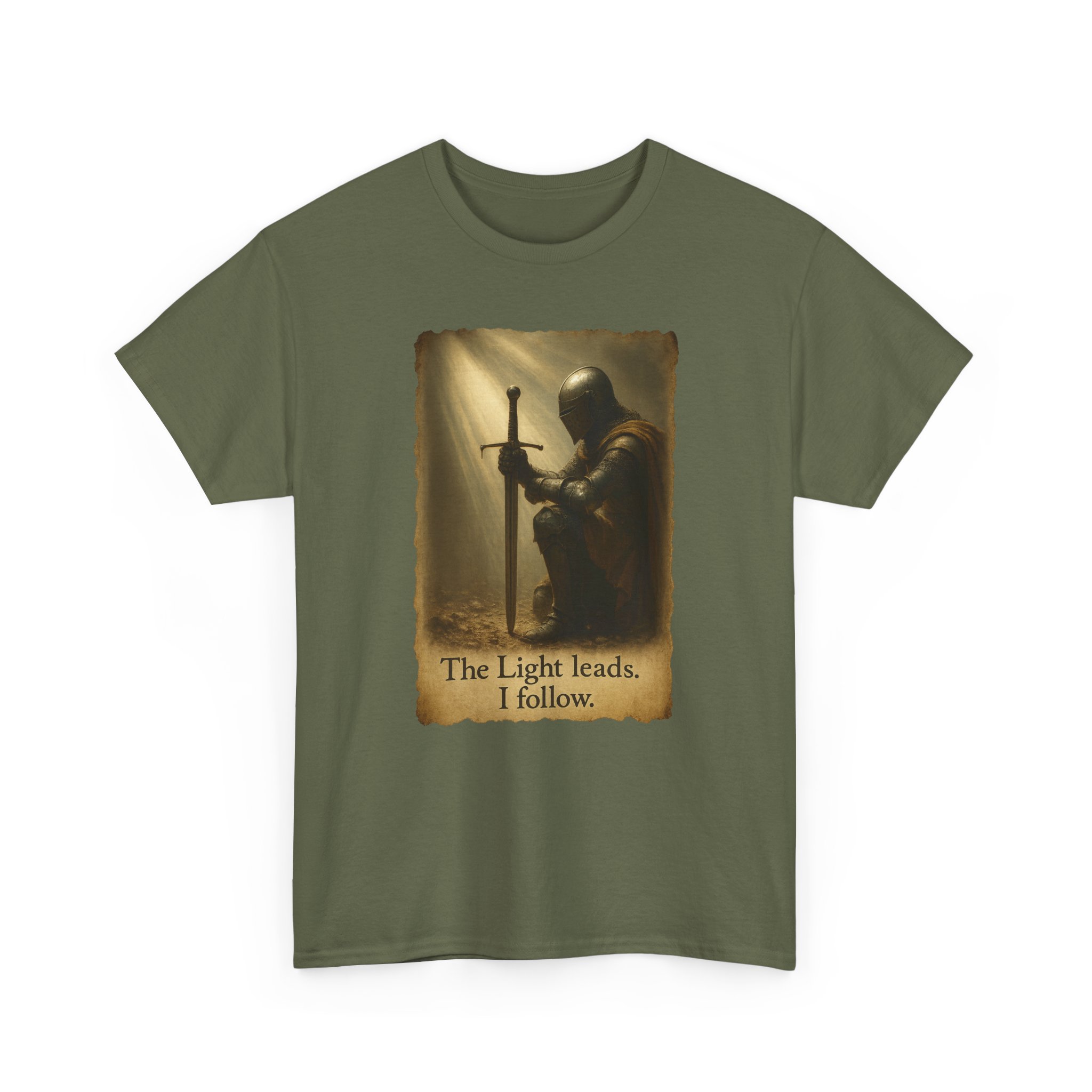 Stand firm in faith and purpose with this bold Crusader Knight tee. Featuring a medieval warrior kneeling in reverence beneath divine rays of light, this design captures the spirit of devotion, honor, and strength. The solemn phrase “The Light leads. I follow.” anchors the message—perfect for those who walk by faith and fight for truth.